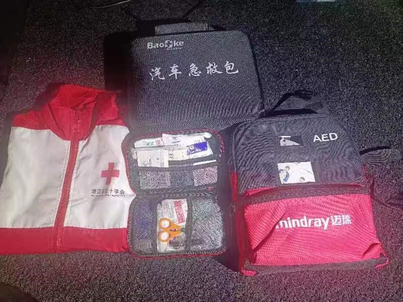 沈俊的车很好认,急救志愿的红色标志被他贴在车身最显眼的位置,三角巾、冰袋、创可贴.、纱布.....甚至 AED 他都随车装载,以备不时之需。