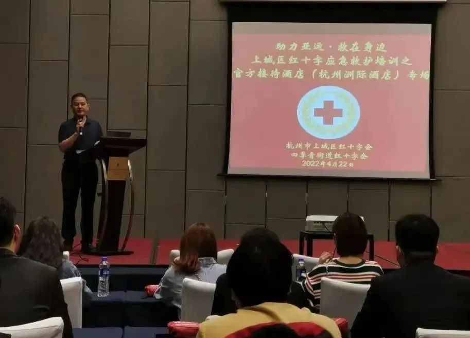【官方接待酒店员工专题培训】2022年4月,在全市率先启动“上城区亚(残)运会官方接待酒店红十字救护员培训”,以“送教上门”形式累计为32家酒店、1268名管理层和员工开展“红十字救护员”持证培训,实现亚运会官方接待酒店急救培训全覆盖。
